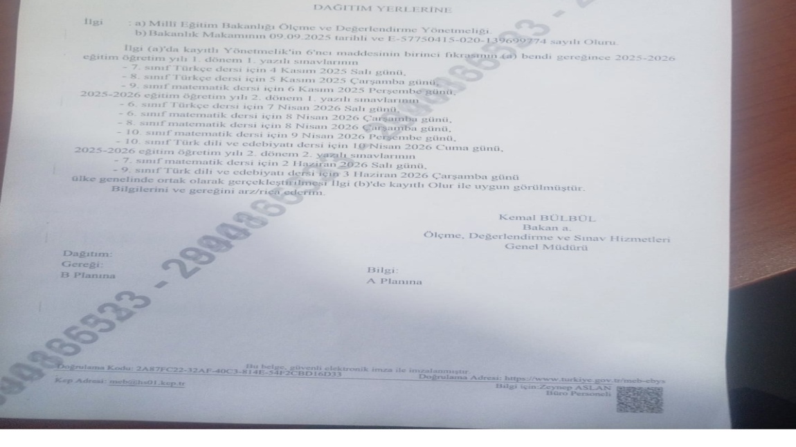 Ülke geneli yapılacak olan ORTAK SINAVLARIN tarihleri belli oldu .1. dönem 1. ortak yazılı sınavı : 7. sınıf Türkçe 4 Kasım 2025 Salı , 8. sınıf Türkçe 5 Kasım 2025 Çarşamba yapılacaktır .2. dönem 1. ortak yazılı sınavı : 6. sınıf Türkçe 7 Nisan 2026 Salı , 6. sınıf Matematik 8 Nisan 2026 Çarşamba yapılacaktır. 2. dönem 2. ortak yazılı sınavı : 7. sınıf Matematik 2 Haziran 2026 Salı yapılacaktır.